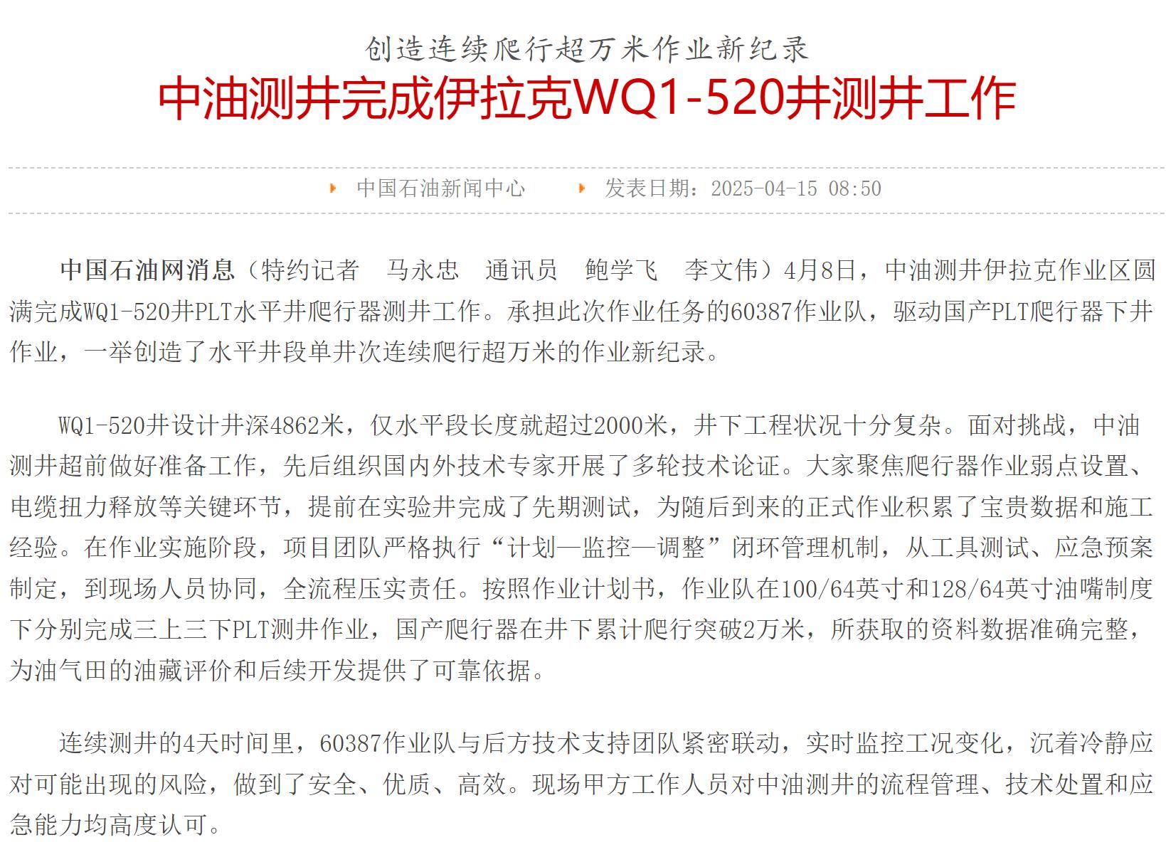 該設(shè)備于2025年4月8日在中石油國際公司嚴(yán)格高效施工管理下,圓滿完成WQ1-520井的萬米PLT水平井爬行器測井作業(yè),一舉創(chuàng)造了水平井段連續(xù)爬行超萬米累計爬行突破2萬米零故障的作業(yè)新紀(jì)錄!